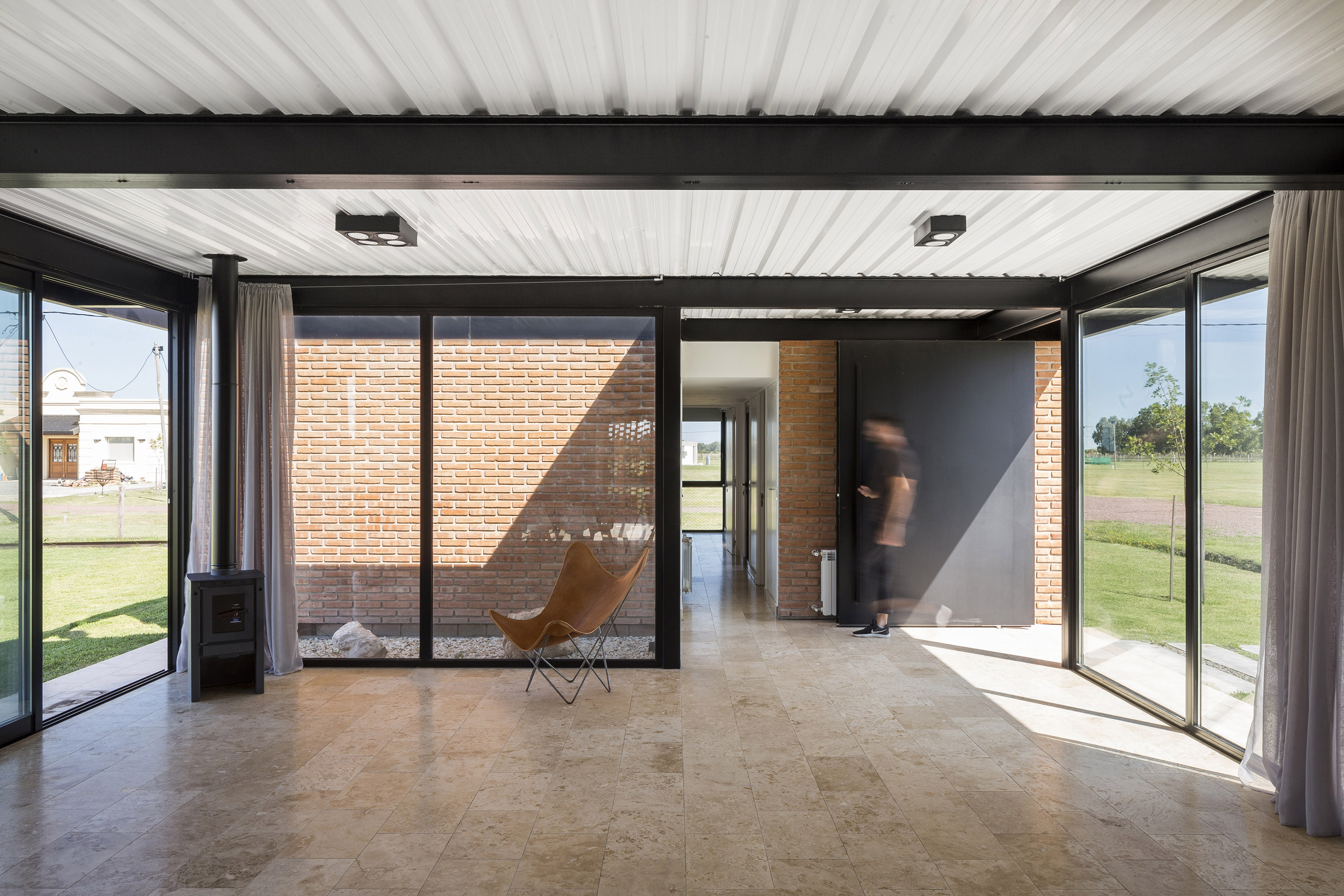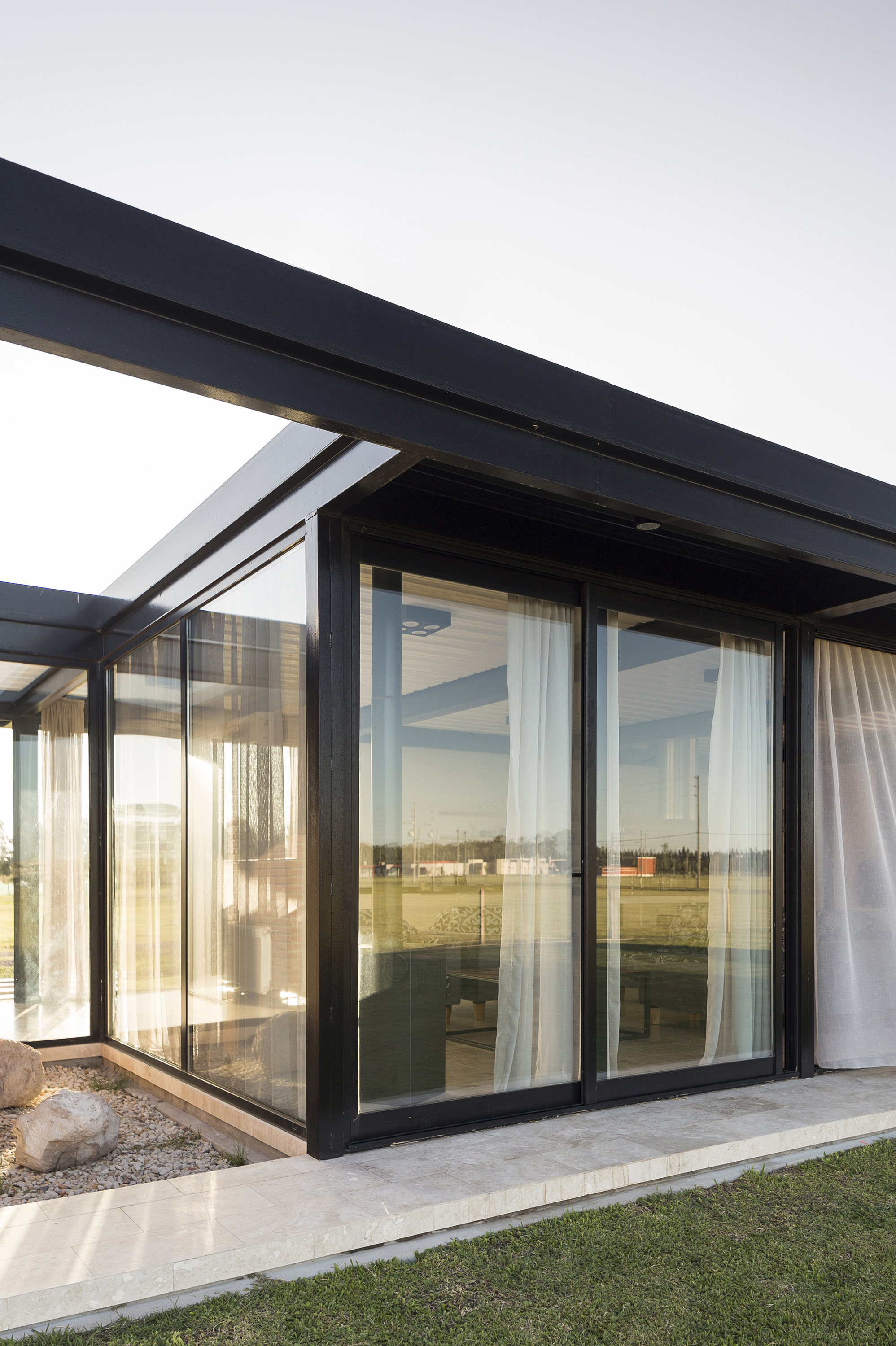 El proyecto consiste en un único volumen, donde el acceso principal, rematado por un patio interno, funciona como fuelle entre las áreas pública y privada y admite también, independencia en los usos. En el área pública se distinguen fácilmente distintos grados de permeabilidad. Grandes ventanales buscan integrar el paisaje con el habitar. La galería, semicubierta, funciona como expansión y transición. La parrilla es precedida por una pérgola, que admite estancias al aire libre y estimula el encuentro familiar.