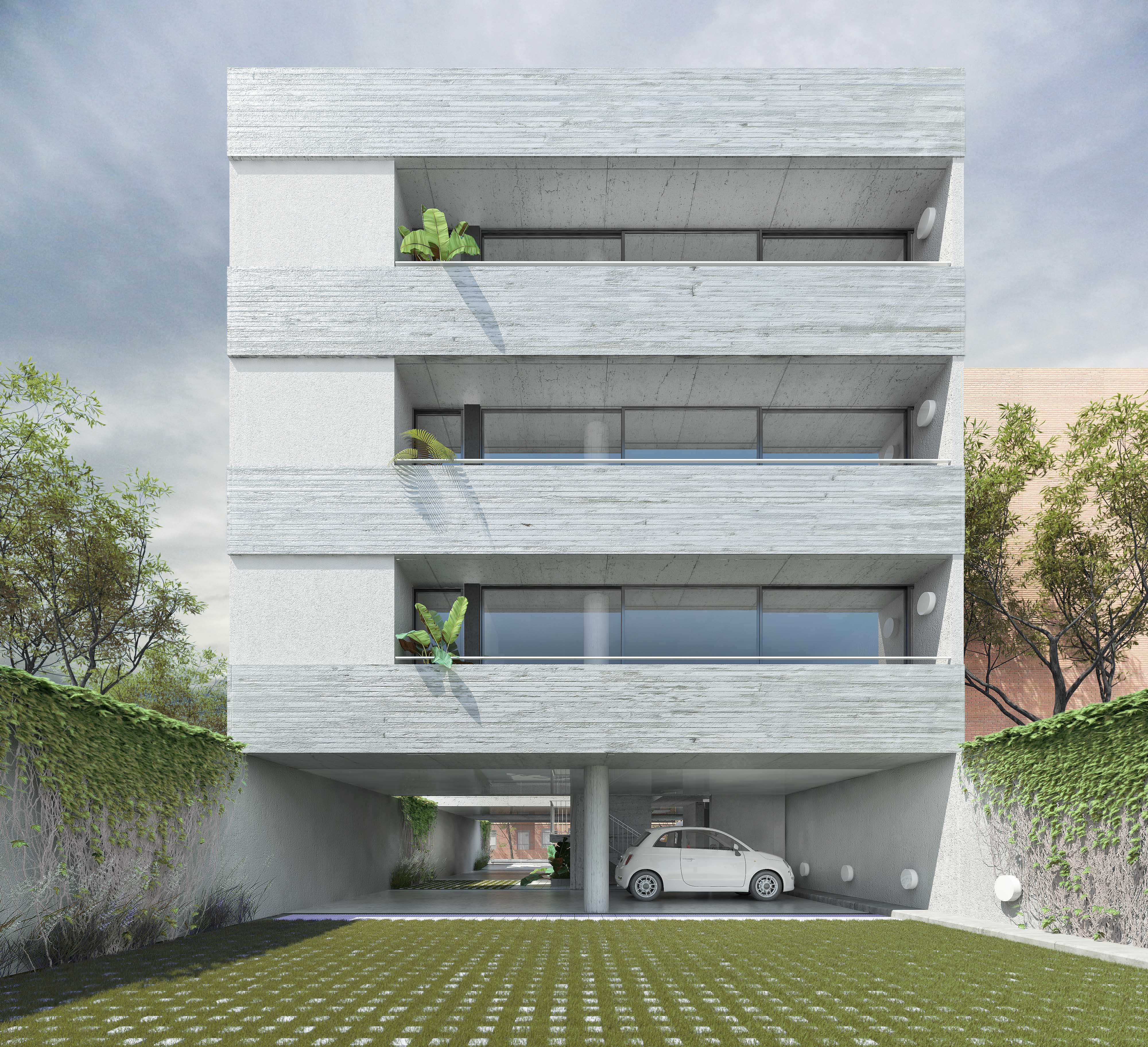 El espacio construido se enfatiza a través de dos bloques macizos de hormigón, perforados por bandas horizontales de punta a punta, reconociendo la apertura total de los departamentos hacia el exterior. Una planta baja totalmente permeable permite identificar la extensión del proyecto y la transición de los vacíos que culminan en el jardín verde que se ubica en el fondo del terreno.