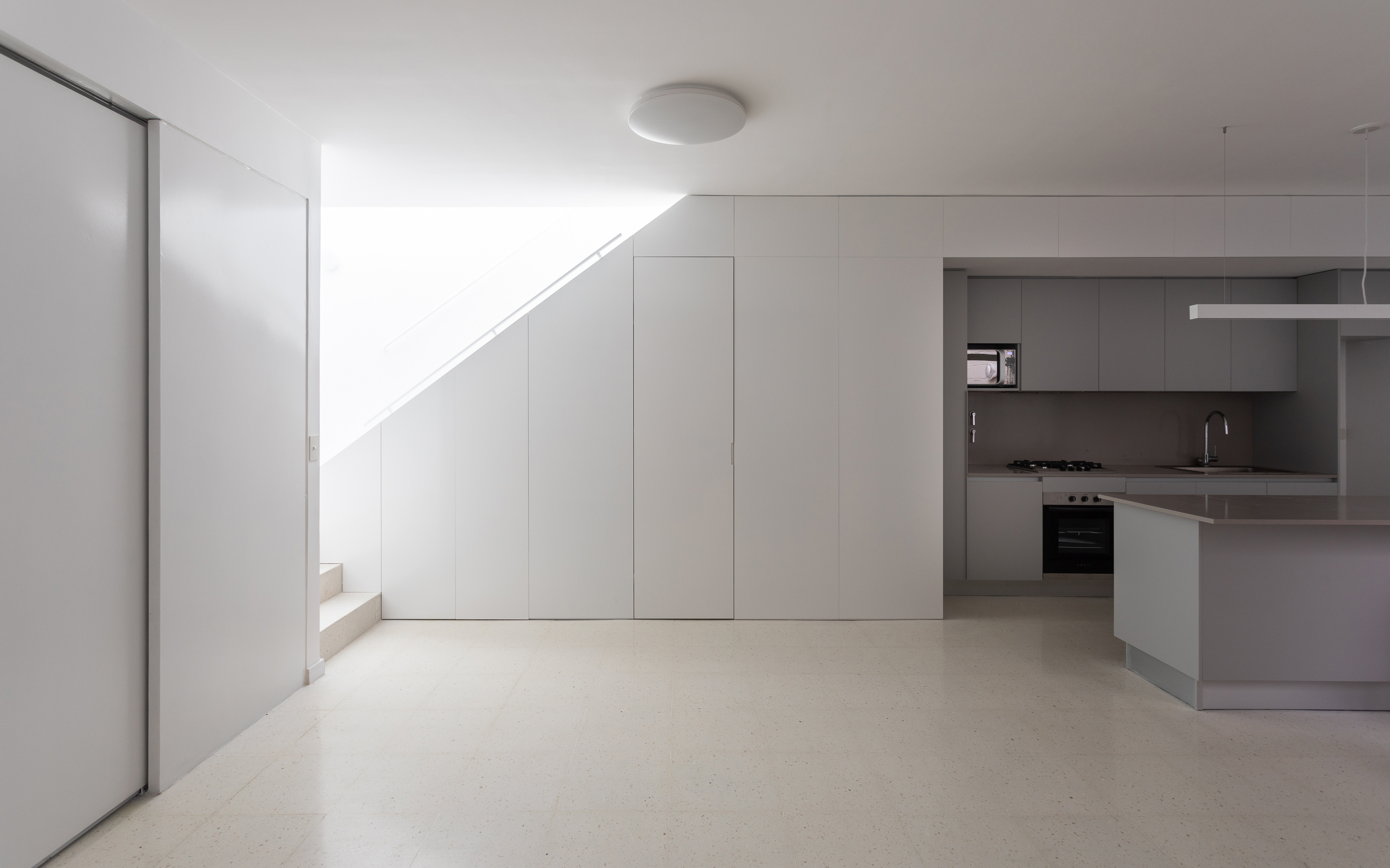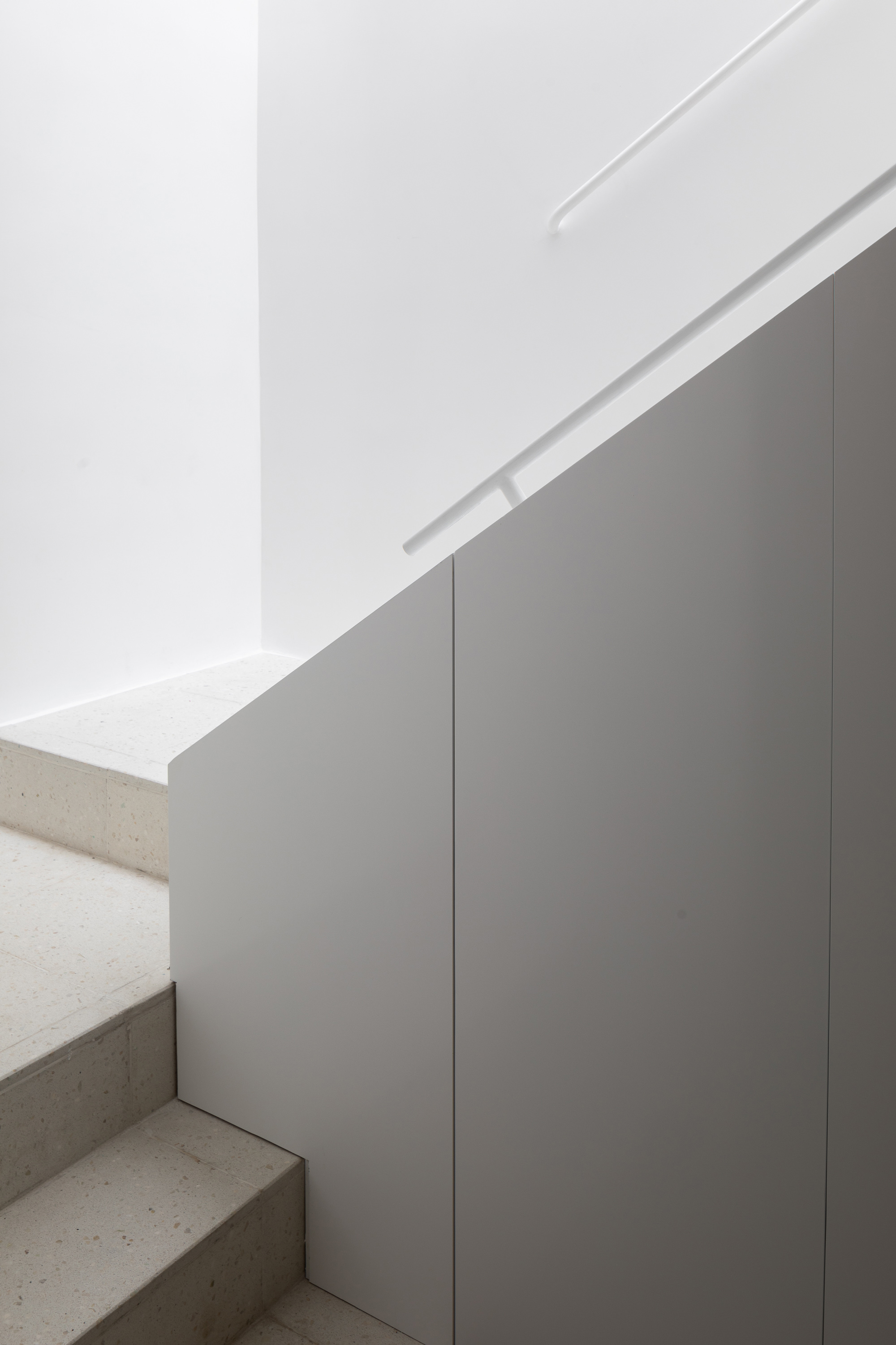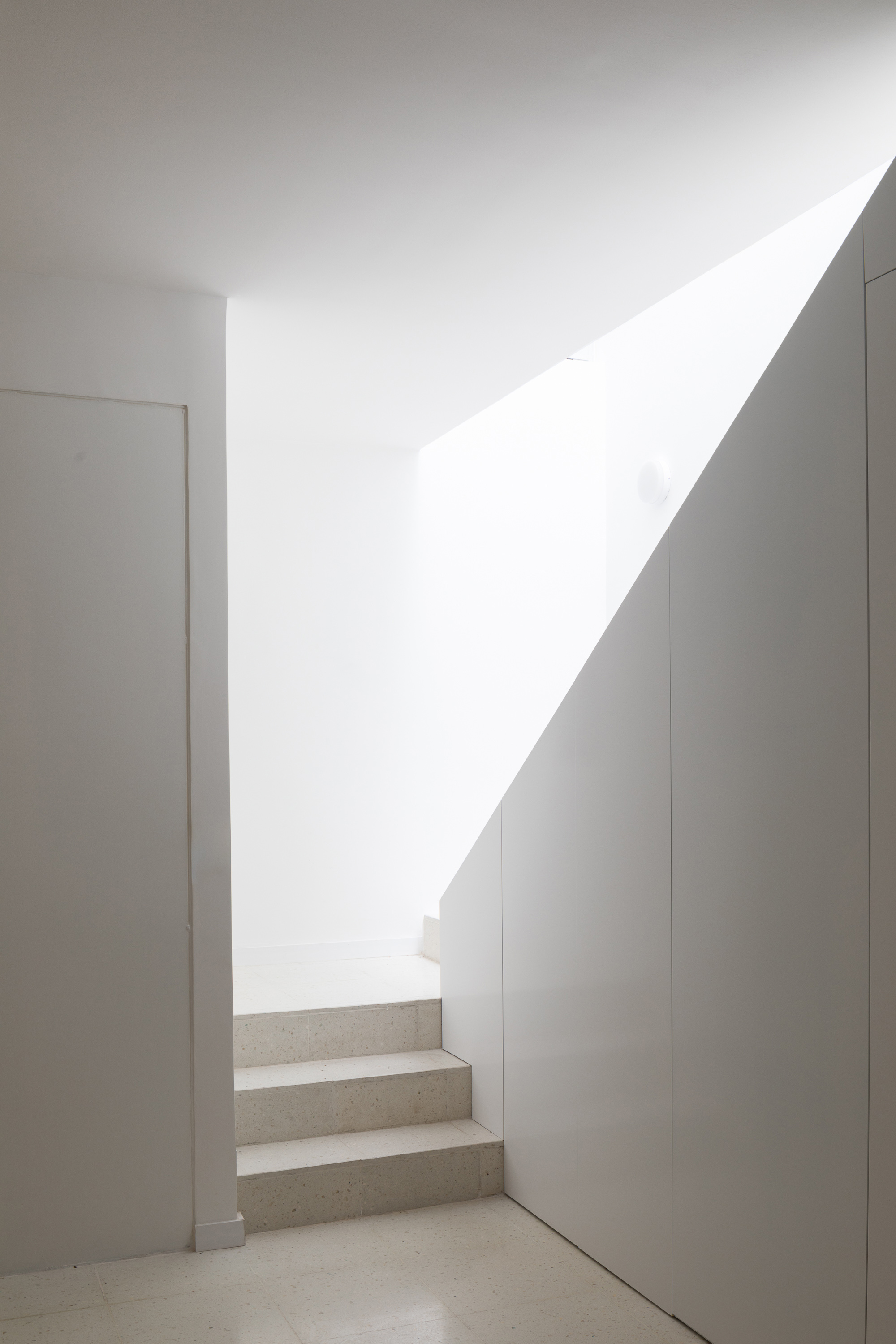 La escalera lateralizada funciona como conector de las dos áreas públicas, permitiendo el vínculo directo entre planta baja y terraza, y manteniendo a resguardo la planta intermedia destinada a alojar los dormitorios. La luz cenital y la alfombra de mosaico granítico dan cierta teatralidad al ascenso y descenso volviéndolo un espacio diáfano e iluminado.