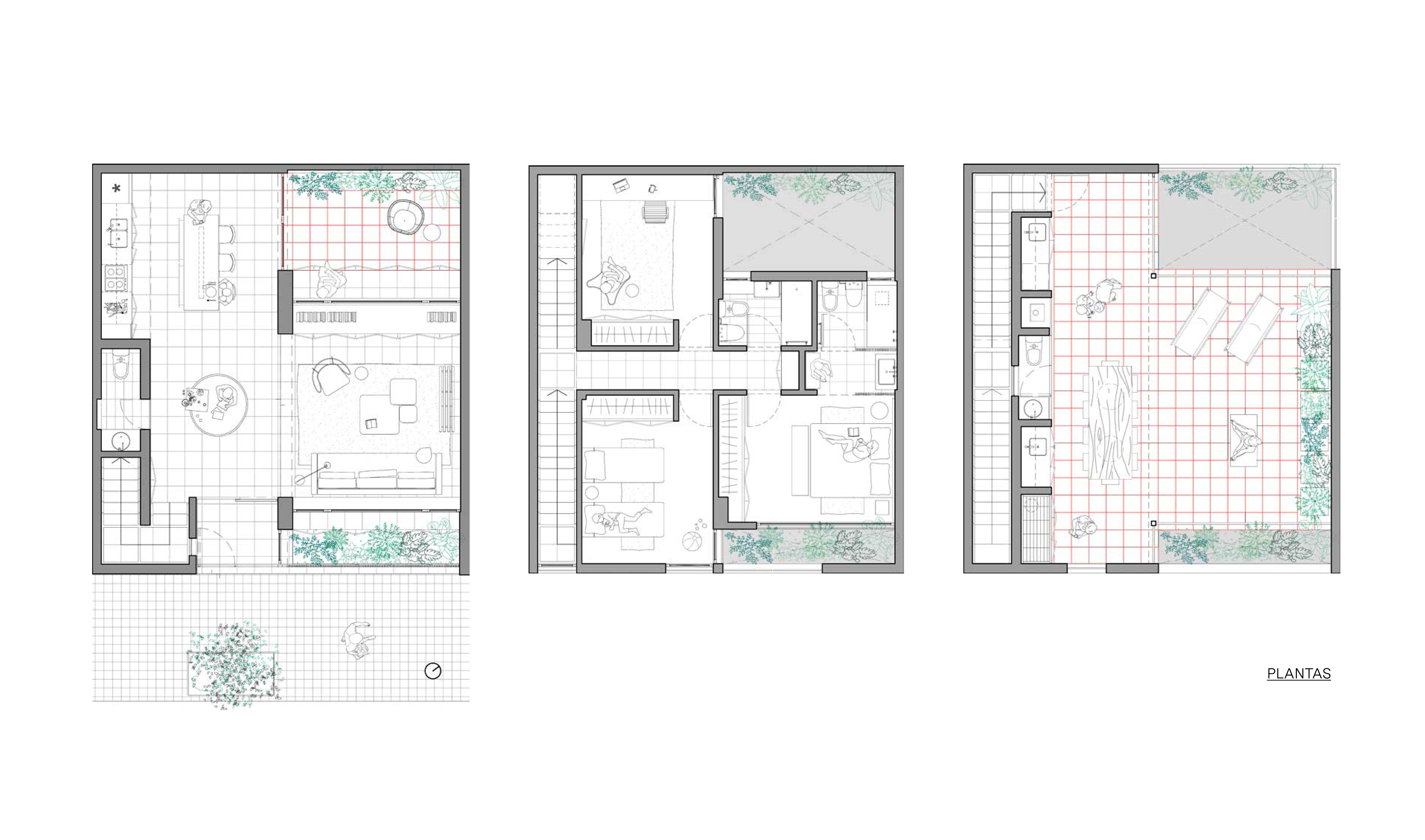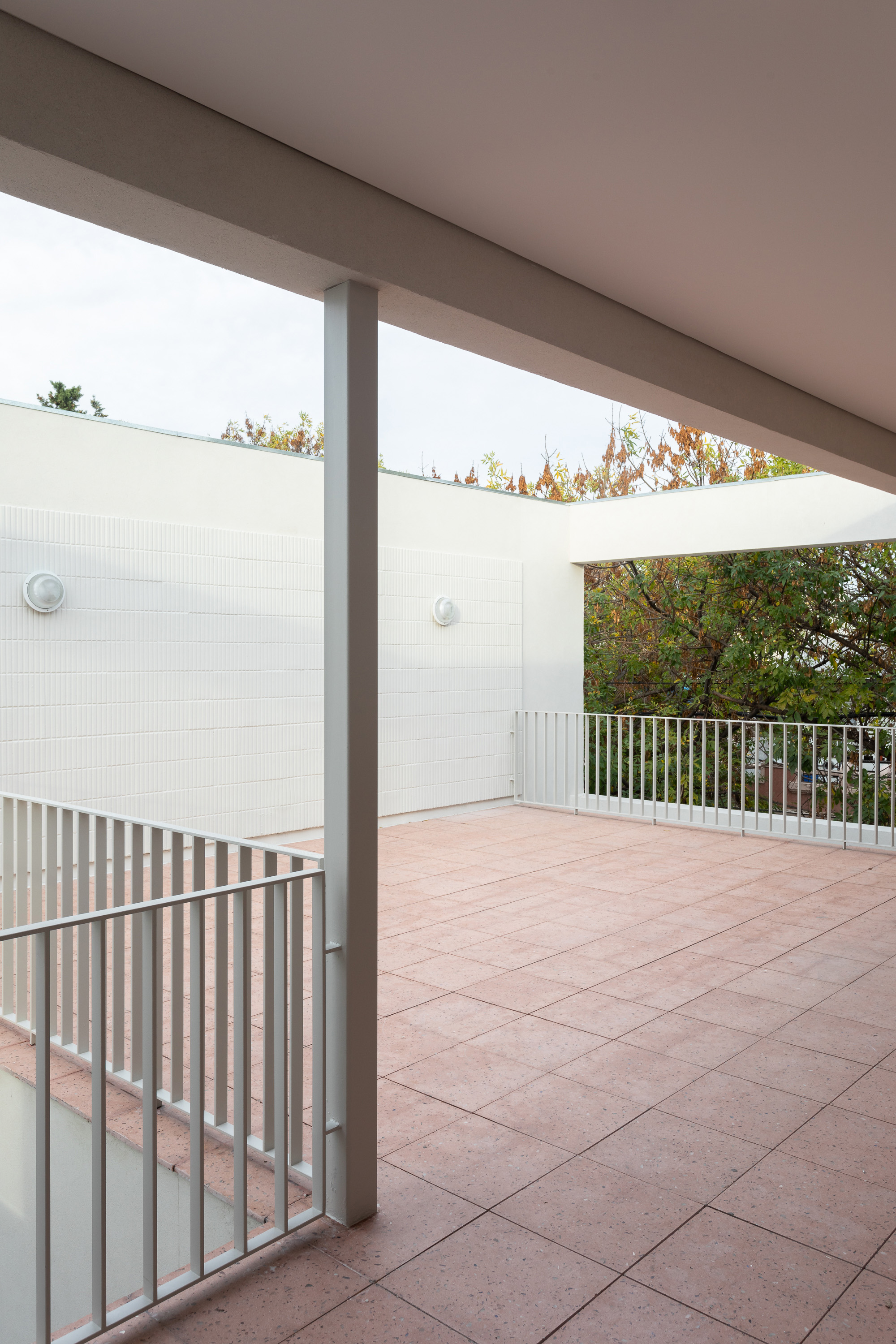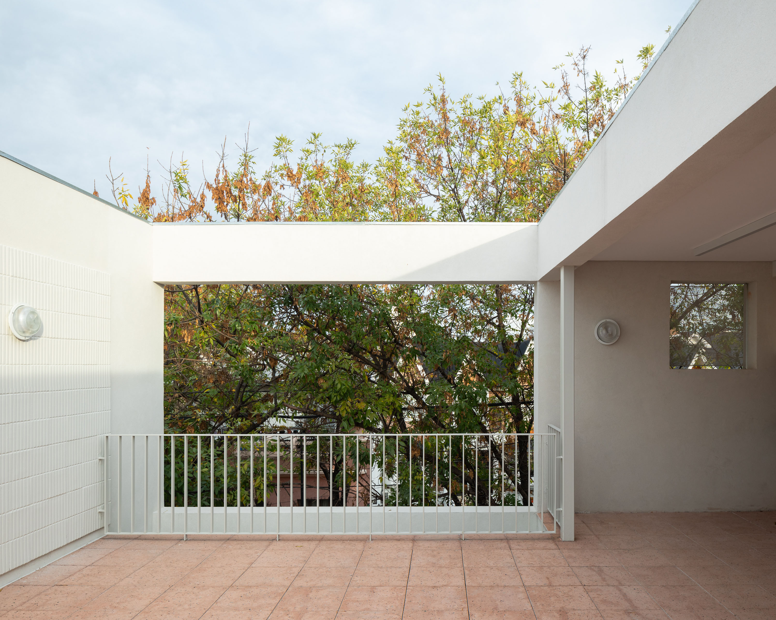 La escalera lateralizada funciona como conector de las dos áreas públicas, permitiendo el vínculo directo entre planta baja y terraza, y manteniendo a resguardo la planta intermedia destinada a alojar los dormitorios. La luz cenital y la alfombra de mosaico granítico dan cierta teatralidad al ascenso y descenso volviéndolo un espacio diáfano e iluminado.