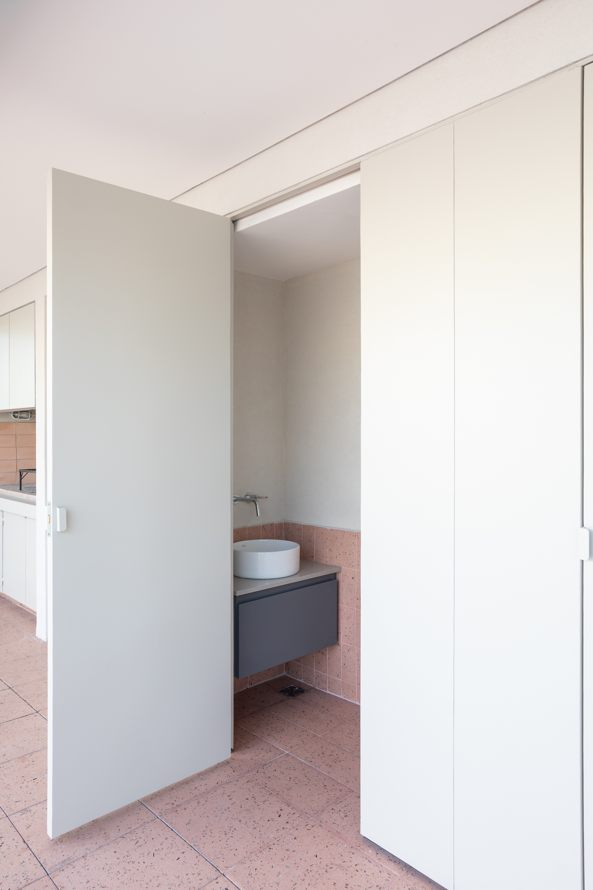 La elección de materiales austeros y poco pretenciosos. Algunos heredados de las casas de antaño, otros de la contemporaneidad: mosaicos calcáreos y graníticos, chapa, todos amalgamados bajo una misma paleta cromática. La elección del color rosa solo presente en los espacios exteriores los destaca y aporta un contraste.